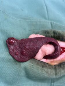 術前の検査にて転移所見などが無いかを確認したうえで、脾臓の摘出を行いました。