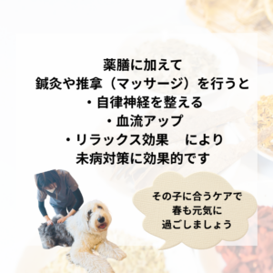 冬から春にかけては環境の変化や寒暖差でペットさん達も「気の巡り」が滞りやすくなります