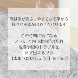 この時期に気になるストレスや自律神経の乱れ・皮膚や眼のトラブルをケア出来るツボ【太衝(たいしょう)】をご紹介