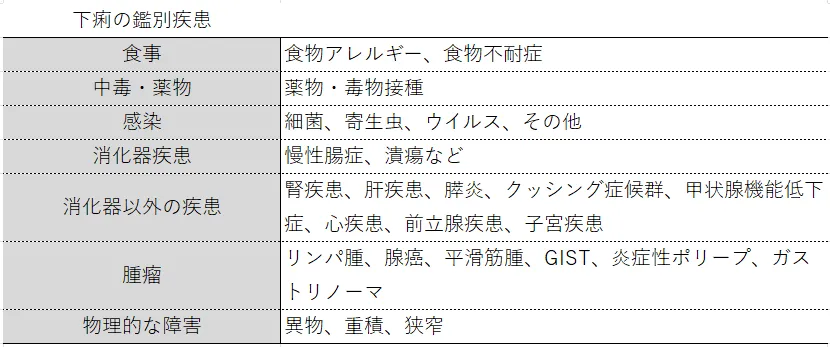 下痢とは水分を多く含んだ多量の排便がある状態であり、消化管の正常機能に障害を与え得るものであればどのようなことも原因となります。